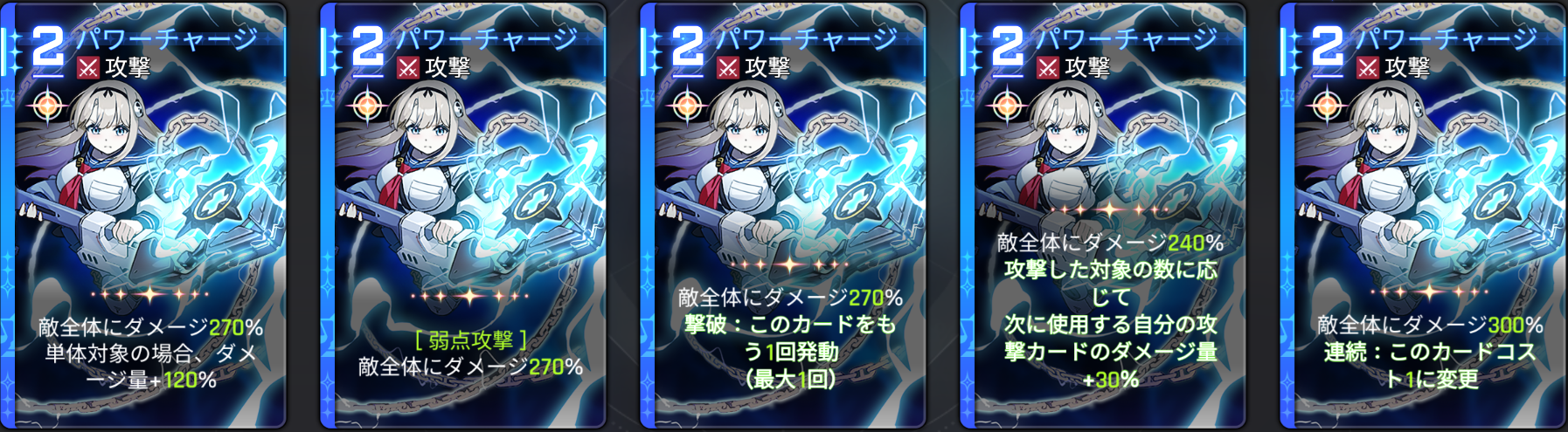 | 2 | 攻撃 | 敵全体にダメージ270%。撃破10):このカードをもう1回発動(最大1回) |