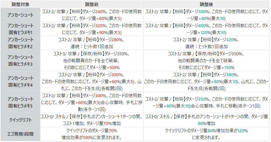 | このカードの強靭度ダメージ100%増加 | アンカーシュート | 〇 | 〇 | |||