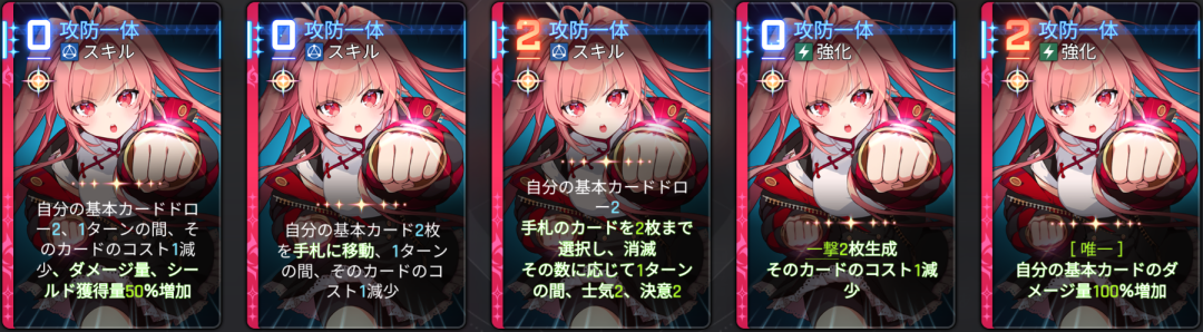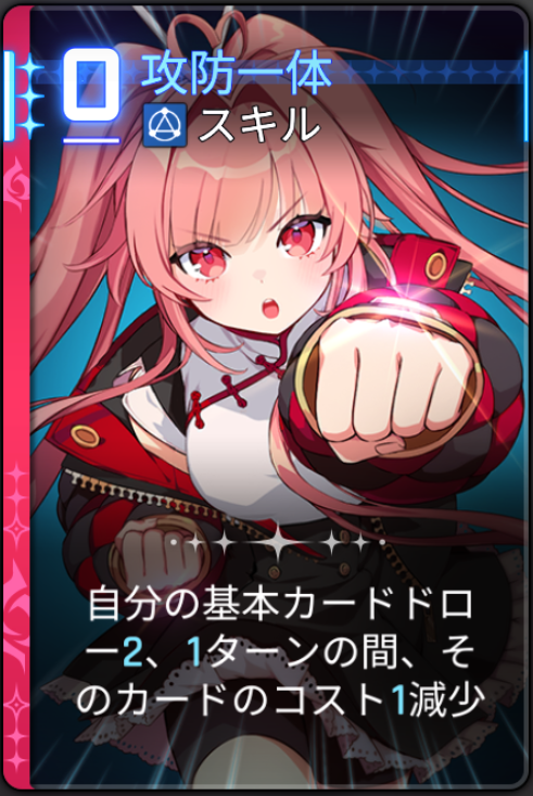 0 スキル 自分の基本カードドロー2、1ターンの間、そのカードのコスト1減少、ダメージ量、シールド獲得量50%増加