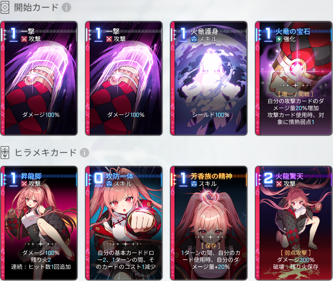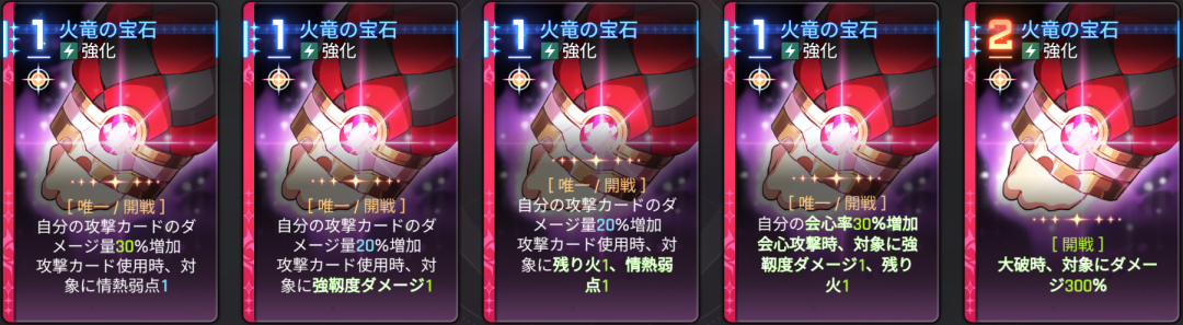 戦闘開始時に、弱点付与が可能な強化カード『火竜の宝石』を持つ。