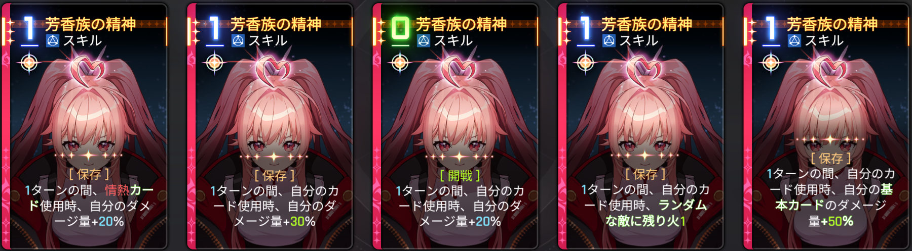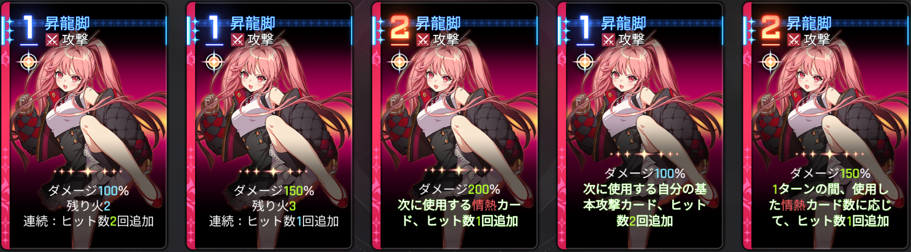 自身の情熱属性の攻撃カードすべてに適用されるため、基本攻撃カードを含めてダメージソースとなる。