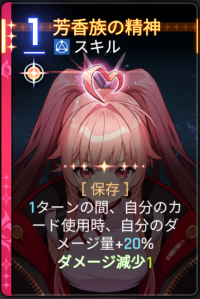 1 スキル [保存]1ターンの間、自分のカード使用時、自分のダメージ量+20% ダメージ減少1