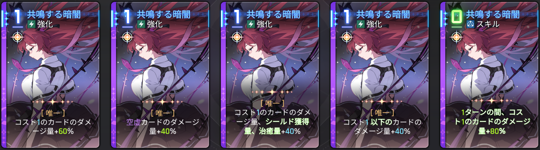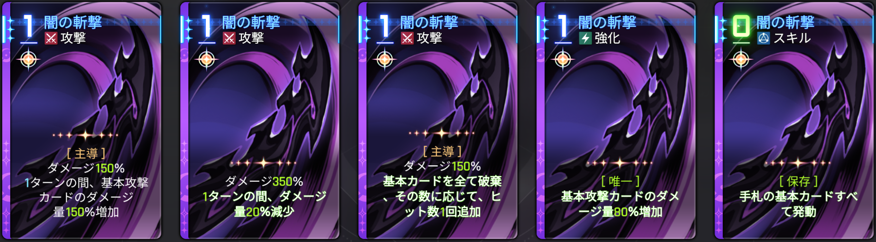 反対にリンやメイリン、ユキなど基本攻撃カードを多用するキャラと組ませる際は闇の斬撃をコピーして複数枚用意したい。